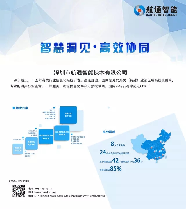 航通智能是國家級高新技術(shù)企業(yè)和雙軟認(rèn)證企業(yè),并獲得CMMI3資質(zhì)認(rèn)證。歷程十五載,航通智能已于海關(guān)行業(yè)監(jiān)管、口岸通關(guān)、保稅物流、加工貿(mào)易、物流信息化應(yīng)用集成領(lǐng)域在全國建設(shè)了數(shù)百個特殊監(jiān)管區(qū)與和監(jiān)管場所信息化系統(tǒng)。其中涉及云卡口、大數(shù)據(jù)風(fēng)險(xiǎn)分析、北斗/GPS監(jiān)控應(yīng)用、RFID射頻識別、移動智能終端等應(yīng)用技術(shù)。業(yè)務(wù)覆蓋全國42個直屬海關(guān)中的36個,關(guān)區(qū)覆蓋率超過85%,核心業(yè)務(wù)市場占有突破60%。