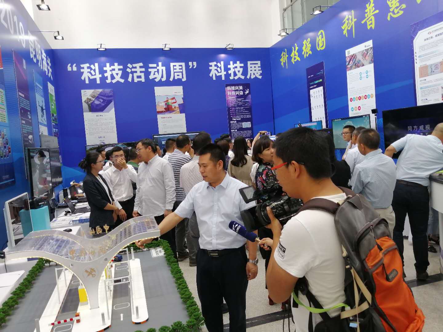 2019昆明海關(guān)“科技活動周”科技展于5月20日至5月26日在昆明海關(guān)一樓大廳正式開啟。本次活動周圍繞“科技強國、科普惠民”的主題,通過展板、展臺、體驗式交互等方式,對科技創(chuàng)新助力云南口岸通關(guān)便利化的發(fā)展歷程、重大成果以及未來規(guī)劃進行了展示?;顒蝇F(xiàn)場航通展出了所開發(fā)的云卡口系統(tǒng)等智能化軟硬件設備、全景業(yè)務監(jiān)測平臺、跨境電商解決方案以及邊民互市貿(mào)易申報系統(tǒng)等全套解決方案。