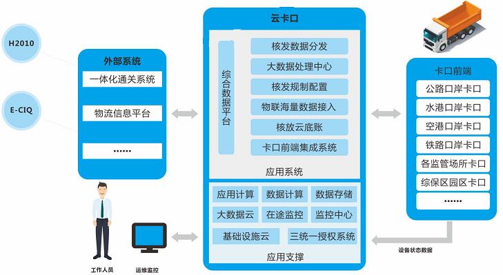 系統(tǒng)主要由前端嵌入式物聯(lián)設備、自適應負載均衡總線、集中管控云平臺、綜合數(shù)據(jù)云底賬監(jiān)控平臺等組成,實現(xiàn)前端物聯(lián)設備分散式接入、集中管理,智能卡口云平臺集中部署,云底賬大數(shù)據(jù)智能分析,全面兼容各類卡口硬件和業(yè)務流程,實現(xiàn)物流底賬與車輛通行集中驗放管理。通過云平臺集中部署,實現(xiàn)前端物聯(lián)設備自適應接入與智能化運行狀態(tài)分析,實現(xiàn)系統(tǒng)軟件插件式集中管理,以及不同卡口功能模塊的集中配置與推送。